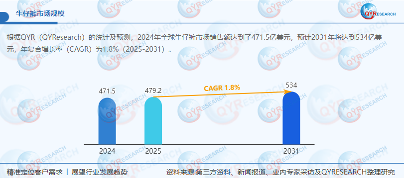 根據(jù)QYResearch的統(tǒng)計(jì)及預(yù)測(cè),2024年全球牛仔褲市場(chǎng)銷售額達(dá)到了471.5億美元,預(yù)計(jì)2031年將達(dá)到534億美元,年復(fù)合增長(zhǎng)率(CAGR)為1.8%(2025-2031)。地區(qū)層面來(lái)看,中國(guó)市場(chǎng)在過(guò)去幾年變化較快,2024年市場(chǎng)規(guī)模為116億美元,約占全球的24%,預(yù)計(jì)2031年將達(dá)到190億美元,屆時(shí)全球占比將達(dá)到35%。